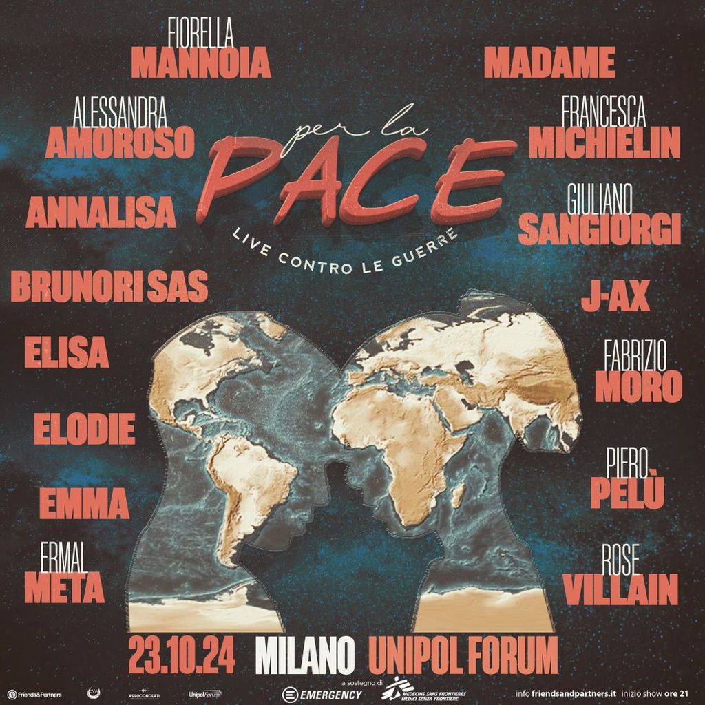 MILANO (ITALPRESS) – Il 23 ottobre la musica italiana si unisce all’Unipol Forum di Milano, Assago, per uno straordinario concerto di solidarietà: “Per la pace – live contro le guerre”, un evento benefico volto a sensibilizzare il pubblico sull’urgenza di promuovere la pace e sostenere chi soffre a causa delle emergenze umanitarie causate dai conflitti. Sul palco: Fiorella Mannoia, Alessandra Amoroso, Annalisa, Brunori Sas, Elisa, Elodie, Emma, J-Ax, Madame, Ermal Meta, Francesca Michielin, Fabrizio Moro, Piero Pelù, Giuliano Sangiorgi, Rose Villain. Il ricavato dall’evento, al netto dei costi di produzione, verrà devoluto a Emergency e Medici Senza Frontiere per la risposta sanitaria all’emergenza nella striscia di Gaza.(ITALPRESS).
