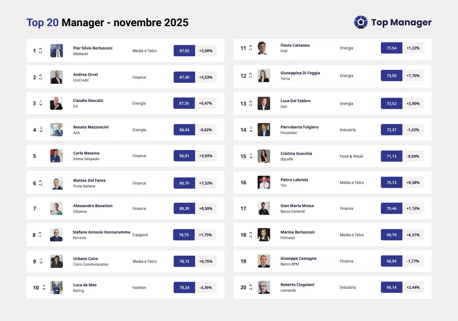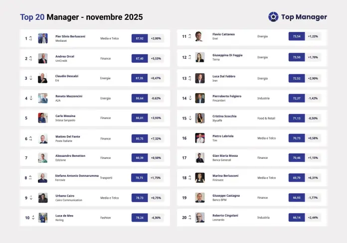 Al sesto sale di quattro l’AD di Poste Matteo Del Fante (80.75) che celebra con CDP e il Presidente Mattarella i 150 del risparmio postale e i 10 anni della quotazione in Borsa. Al settimo si conferma Alessandro Benetton (80.39), all’ottavo sale di uno l’AD di FS Stefano Donnarumma (78.75) che strategicamente guarda all’alta velocità in Germania. Urbano Cairo (78.73) e Luca de Meo (78.24) chiudono la top 10. All’undicesimo sale di uno Flavio Cattaneo (73.54) AD di Enel che segna il massimo storico in borsa, con un balzo del 50% dall’inizio del suo mandato nel 2023. Sale di uno anche l’AD di Terna Giuseppina Di Foggia (73.50) che chiude i nove mesi in crescita e con oltre 2 miliardi di investimenti. Al tredicesimo sale di due il Presidente di Iren Luca Dal Fabbro (72.52) con risultati in crescita e investimenti che superano il miliardo, la maggior parte dei quali sulla sostenibiltà. Seguono: Pierroberto Folgiero (72.37), Cristina Scocchia (71.13), Pietro Labriola (70.73) e Gian Maria Mossa (70.46). Al diciottesimo sale di due Marina Berlusconi (69.79), al diciannovesimo si conferma Giuseppe Castagna (66.93).