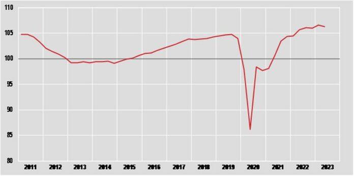 In termini di variazione acquisita, per il 2023 la crescita si attesta nel secondo trimestre allo 0,8%, in leggera discesa rispetto al valore del primo trimestre, che era stato pari allo 0,9%.