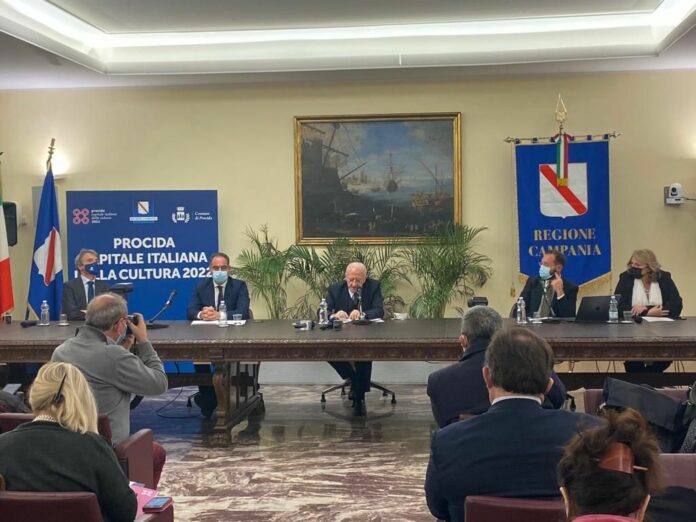NAPOLI (ITALPRESS) – La bellezza di 150 eventi distribuiti su 330 giorni di programmazione, il coinvolgimento di oltre 2000 cittadini e la partecipazione di 350 artisti provenienti da 45 paesi differenti: sono i numeri di Procida Capitale italiana della Cultura 2022 svelati questa mattina a Napoli in una conferenza stampa nella sede della Regione Campania nella quale è stato illustrato a grandi linee il ricchissimo programma. “La cultura non isola” è il grande tema della manifestazione i cui appuntamenti sono stati suddivisi in cinque sezioni declinate con altrettanti verbi: Procida inventa, ispira, include, impara e innova. Lo slogan d’impatto è quanto mai attuale, ma gli organizzatori assicurano che il riferimento al Covid non era voluto: “Il nostro viaggio è nato prima dell’avvento della pandemia e il tema era già stato individuato – racconta il direttore di Procida 2022, Agostino Riitano -. La cultura però è una questione di legami e noi cercheremo di rammendare tutte quelle relazioni che si sono stralciate in questa pagina terribile della nostra storia contemporanea. Ci immaginiamo l’isola come un laboratorio culturale di felicità sociale” aggiunge Riitano che racconta di mesi intensissimi per arrivare nel modo migliore all’appuntamento.