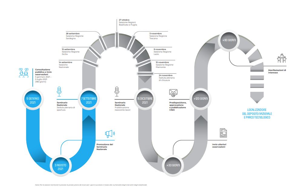 Il Seminario nazionale si articolerà in nove incontri, trasmessi in diretta streaming sul sito seminariodepositonazionale.it. Oltre alle sedute plenarie di apertura e chiusura sono programmate sette sessioni di lavoro, una nazionale e sei territoriali, che interesseranno le aree potenzialmente idonee presenti nelle regioni coinvolte: Piemonte, Toscana, Lazio, Puglia e Basilicata, Sicilia, Sardegna.