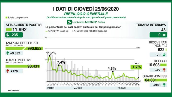 MILANO (ITALPRESS) – Risale il contagio in Lombardia, dove oggi i nuovi positivi al coronavirus sono 170 (ieri erano 88), di cui 53 a seguito di test sierologici effettuati a Bergamo e 84 ‘debolmente positivì. Lo riferisce il consueto bollettino regionale sui dati epidemiologici. Ad aumentare sono anche i decessi, oggi 22 contro i 7 di ieri, per un numero complessivo di 16.608.