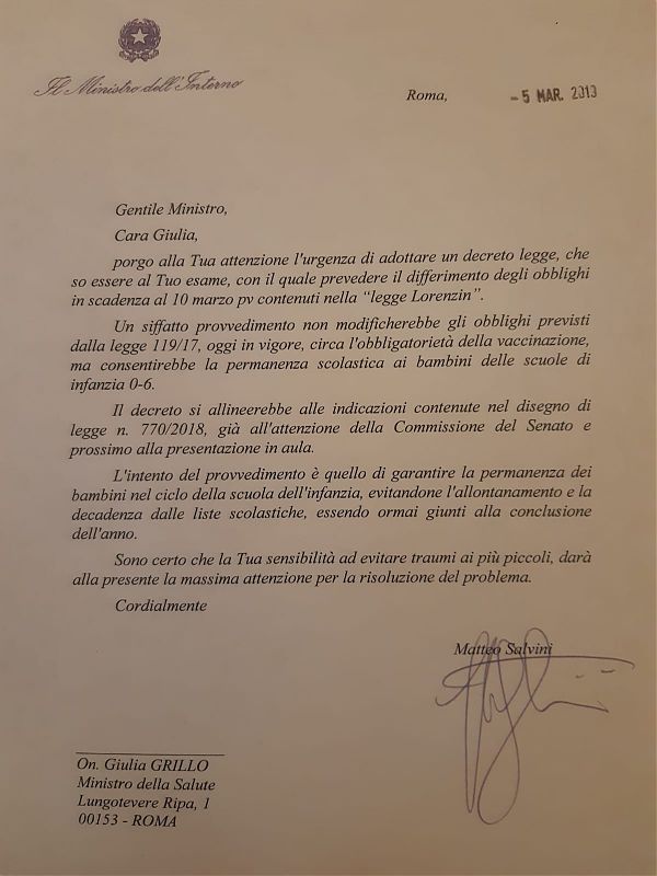ROMA (ITALPRESS) – Un decreto per consentire la permanenza scolastica ai bambini non vaccinati delle scuole di infanzia 0-6 anni. È quello che chiede il vicepremier e ministro dell’Interno Matteo Salvini in una lettera alla collega della Salute, Giulia Grillo. “L’intento del procedimento”, scrive il responsabile del Viminale, “è quello di garantire la permanenza dei bambini nel ciclo della scuola dell’infanzia, evitandone l’allontanamento e la decadenza dalle liste scolastiche, essendo ormai giunti alla conclusione dell’anno”. Per Salvini è necessario “evitare traumi ai più piccoli” e quindi “prevedere il differimento degli obblighi in scadenza al 10 marzo prossimo contenuti nella legge Lorenzin”.