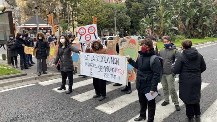 “La Campania è un’anomalia in confronto agli altri paesi europei – afferma all’Italpress Laura Falcone, genitore e membro del coordinamento Scuole Aperte -. In tutta Italia si sta discutendo di riaprire le superiori a partire dal’11 gennaio, noi abbiamo i bambini dell’asilo e di prima elementare ancora a casa. Ci sono regioni che hanno indici di contagio peggiore del nostro e non hanno mai chiuso” conclude la mamma prima di unirsi alle decine di altre mamme che stamattina si sono date appuntamento alle 13 davanti al Casanova di Piazza Cavour. “Se la scuola non riapre semaforo rosso per tutti” è lo slogan della manifestazione andata in scena davanti all’Istituto Comprensivo dove i no Dad hanno rallentato il traffico con attraversamenti stradali accompagnati da cori e sagome in cartone di scolari. “La scuola è a scuola, usciamo dagli schermi” si legge su uno striscione esposto sulle vetrate del Casanova mentre per strada si alza la voce di protesta dei genitori che parlano di “emergenza democratica”.