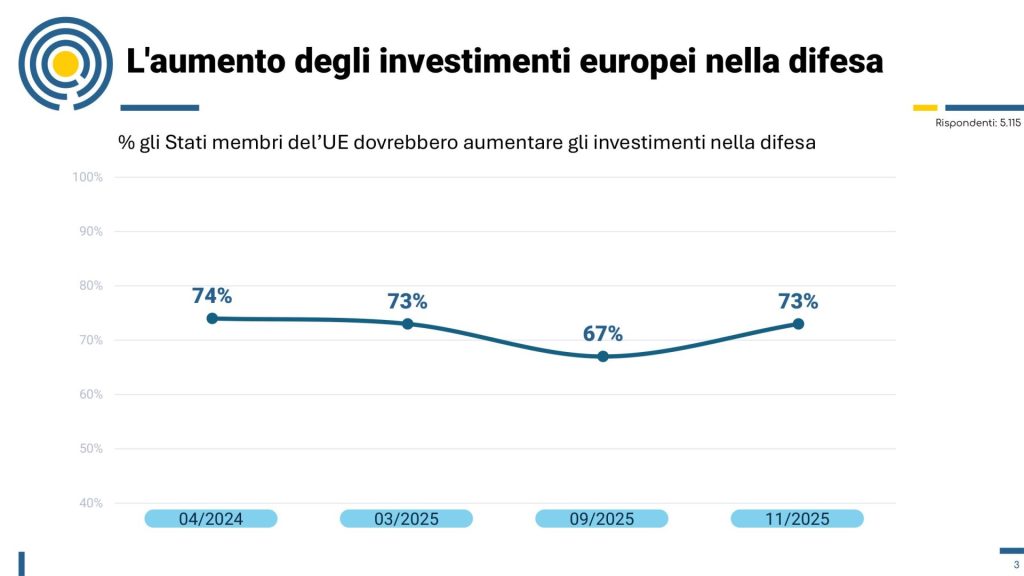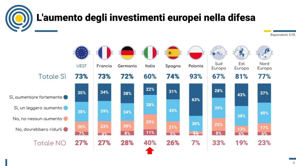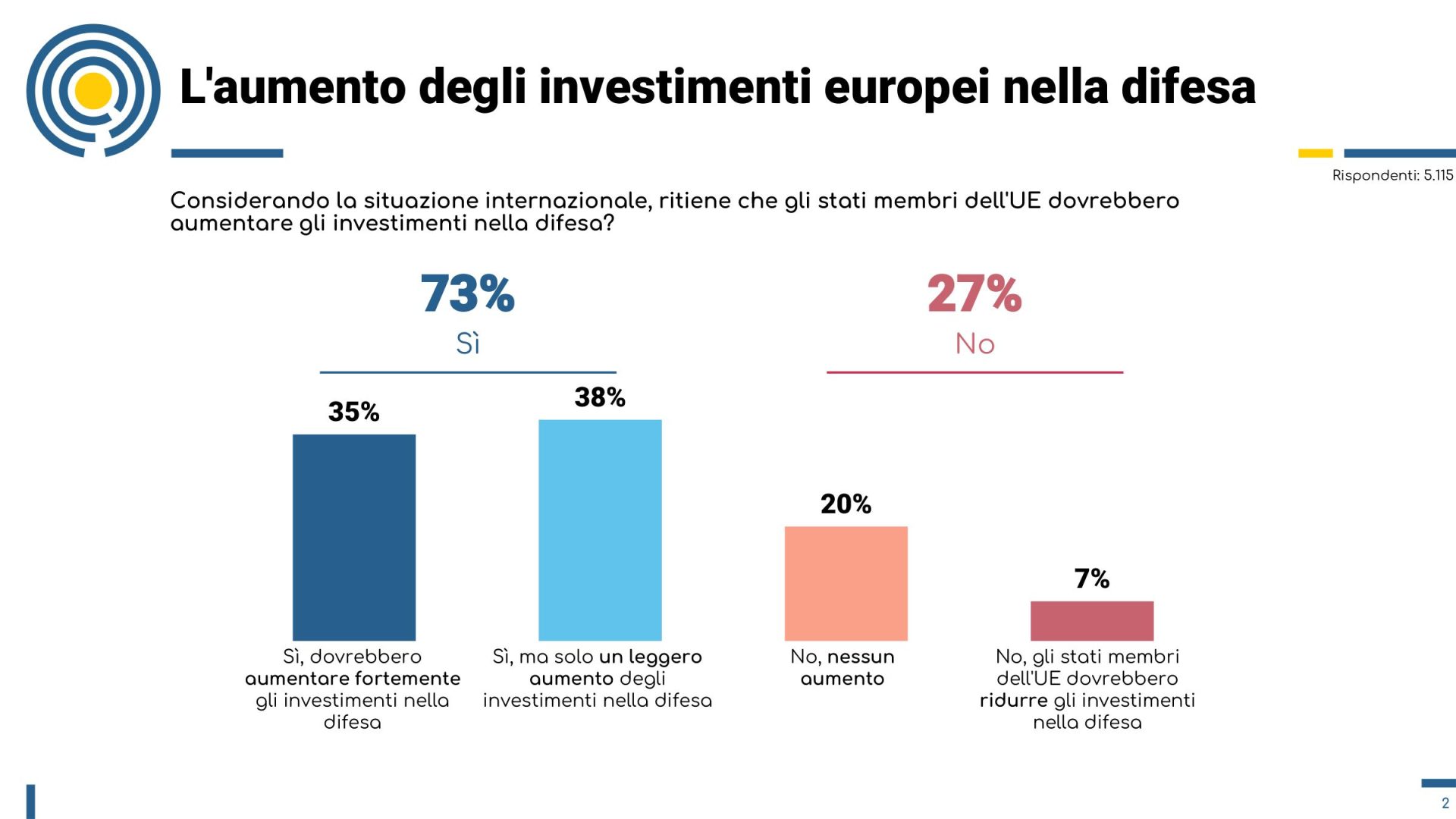Secondo i dati della ricerca, il 73% dei cittadini europei si dichiara d’accordo con un incremento delle spese militari a livello continentale, mentre solo il 27% si oppone.