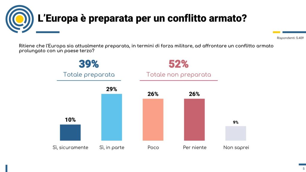 Ma perché i cittadini europei chiedono di rafforzare la difesa? La risposta è legata a un diffuso senso di vulnerabilità. “Oltre la metà degli europei ritiene infatti che il continente non sia preparato ad affrontare un eventuale conflitto armato con un’altra superpotenza – sottolinea Fonda -. È proprio questa percezione di inadeguatezza a generare incertezza e timore, spingendo molti a sostenere un potenziamento dei sistemi militari europei”.