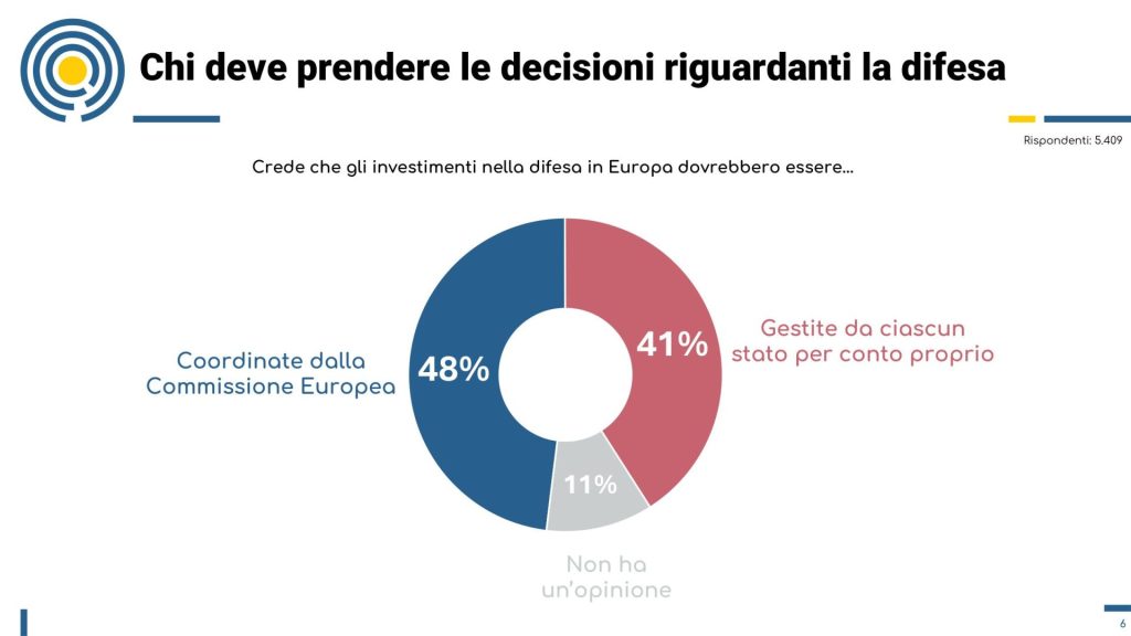 Sul fronte della governance della difesa, l’opinione pubblica europea appare invece spaccata. Circa il 48% dei cittadini vorrebbe che le decisioni in materia di difesa e investimenti fossero coordinate a livello europeo, sotto la guida della Commissione. Il 41%, invece, preferirebbe che queste scelte restassero di competenza dei singoli Stati nazionali.