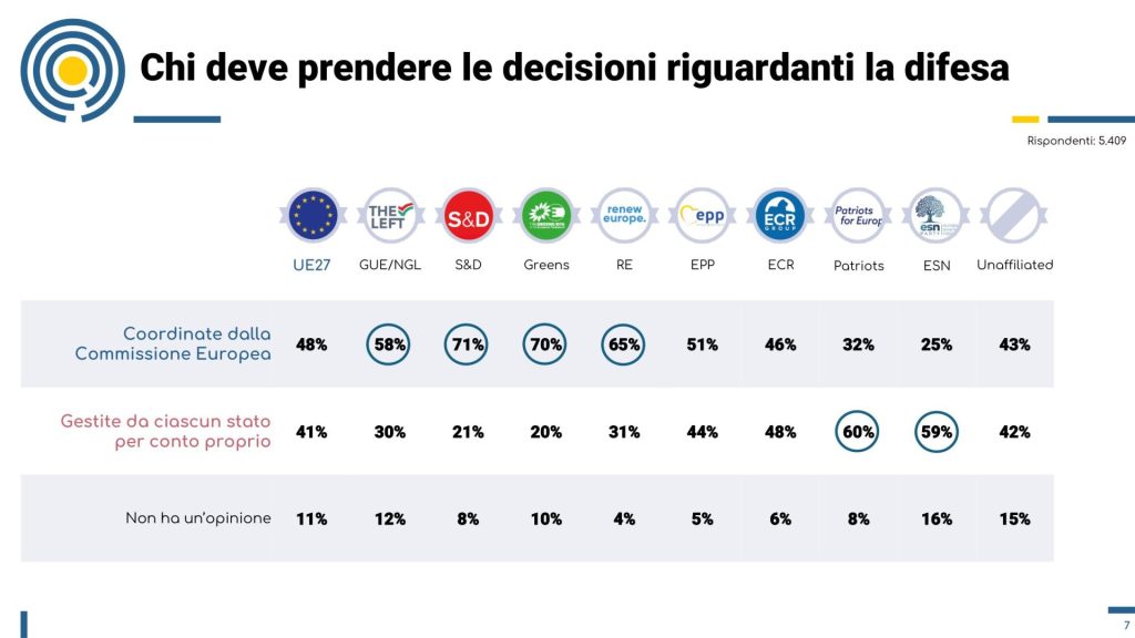 Questa divisione riflette nettamente le appartenenze politiche degli elettori. Gli elettori di sinistra, dell’area socialdemocratica, dei Verdi e dei gruppi liberali sono i più favorevoli a una gestione sovranazionale della difesa. Al contrario, gli elettori di destra, in particolare quelli dei gruppi Patriots e di partiti come Alternative fur Deutschland (AfD) in Germania, Rassemblement National di Marine Le Pen in Francia, e in Italia la Lega e in parte Fratelli d’Italia, spingono per mantenere la governance a livello nazionale.