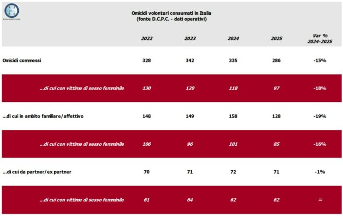 Tra le 97 vittime del 2025 si segnala che 85 sono state uccise per mano di un soggetto riconducibile all’ambito familiare-affettivo, una casistica che segna un -16% rispetto al 2024.