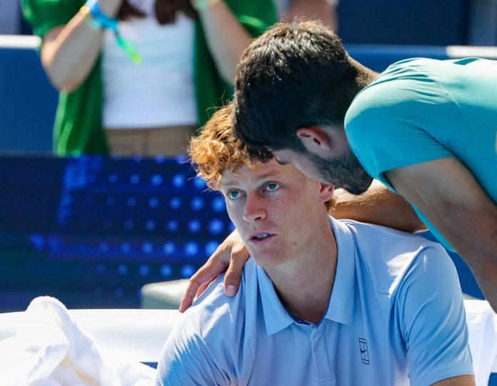 CINCINNATI (STATI UNITI) (ITALPRESS) – Ci si aspettava la solita maratona e invece la sesta finale tra Jannik Sinner e Carlos Alcaraz dura solamente 23 minuti. Finisce con il ritiro del numero 1 al mondo l’ultimo atto del Masters 1000 di Cincinnati, che sin dai primi scambi prende le sembianze di un monologo dello spagnolo, capace di portarsi sul 5-0 dopo aver strappato il servizio a zero in apertura. La reazione di Jannik sul cemento – dove non perdeva da 26 partite – non c’è. L’altoatesino appare debilitato e prima del sesto gioco alza bandiera bianca, con Alcaraz puntuale nel consolarlo. “Sorry Jannik”, scrive sulla telecamera lo spagnolo che non rinuncia ad incoraggiare l’amico-rivale, numero 1 al mondo, in vista degli Us Open: “Tornerai più forte di prima come hai sempre fatto, da vero campione”.