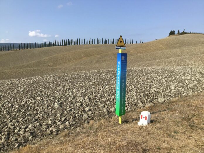 Le prime paline rivestite sono apparse in Val d’Orcia, in alcuni punti nei quali la Francigena interseca la rete Snam. Altre installazioni sono previste in Puglia nelle prossime settimane.