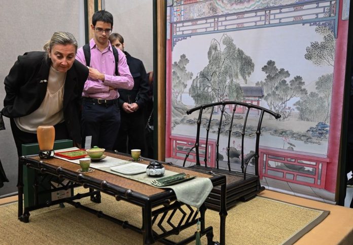 MADRID (SPAGNA) (XINHUA/ITALPRESS) – Dei visitatori osservano i reperti esposti durante la mostra intitolata “Anshan Cuijin – Una mostra sull’estetica della vita cinese” presso il Centro culturale cinese di Madrid, in Spagna, il 16 dicembre 2025. La mostra ha preso il via qui martedì e resterà aperta fino a marzo 2026, presentando l’elegante fascino dell’estetica cinese.
