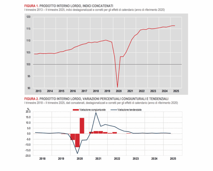 Il secondo trimestre del 2025 ha avuto una giornata lavorativa in meno sia rispetto al trimestre precedente, sia rispetto al secondo trimestre del 2024. La variazione congiunturale è la sintesi di una diminuzione del valore aggiunto nel comparto dell’agricoltura, silvicoltura e pesca e in quello dell’industria e di una sostanziale stazionarietà nei servizi. Dal lato della domanda, si rileva un contributo positivo della componente nazionale (al lordo delle scorte) e un apporto negativo della componente estera netta. La variazione acquisita per il 2025 è pari a +0,5%.