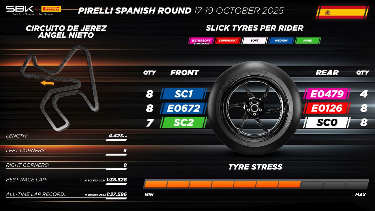 “In questa stagione abbiamo introdotto diverse novità che hanno riguardato gran parte delle soluzioni in gamma, in particolare quelle posteriori – le parole di Giorgio Barbier, direttore Racing Moto Pirelli -. La nuova struttura applicata alle SC0 e SCX ha dato riscontri molto positivi, tanto che le rispettive versioni di sviluppo, E0125 ed E0126, sono risultate tra le più utilizzate nei round in cui sono state messe a disposizione. Questo ci ha permesso di raccogliere dati importanti nel corso della stagione e con l’ultimo appuntamento di Jerez potremo tirare le somme sul lavoro svolto e i risultati ottenuti. In Spagna riproponiamo la supersoft E0126 perché riteniamo che possa adattarsi molto bene alle caratteristiche del tracciato, e allo stesso tempo vogliamo offrire continuità tra le specifiche posteriori utilizzate in questo round e in quello precedente di Estoril, anche allo scopo di favorire il lavoro di test sulla nuova anteriore di sviluppo, la E0672, che ha debuttato proprio in Portogallo lo scorso fine settimana riscuotendo commenti molto positivi e un ampio apprezzamento, ma che necessita di ulteriori verifiche per valutarne a fondo le prestazioni. La mescola SC1 che adotta è ormai consolidata e ben conosciuta e ci siamo concentrati sullo sviluppo di una nuova struttura che offra maggiore stabilità in frenata e in inserimento curva. Per ora i primi riscontri da parte dei piloti che l’hanno utilizzata ad Estoril sono incoraggianti, ma sarà interessante valutarne il comportamento anche in un circuito più impegnativo per l’anteriore come Jerez. Riproporremo anche la posteriore SCQ di sviluppo E0479, che abbiamo già portato in quattro round, tra cui Misano, dove, con temperature dell’asfalto superiori ai 47 °C, è stata ampiamente utilizzata e molto apprezzata. Se a Jerez troveremo condizioni simili, potremo raccogliere ulteriori dati utili.”