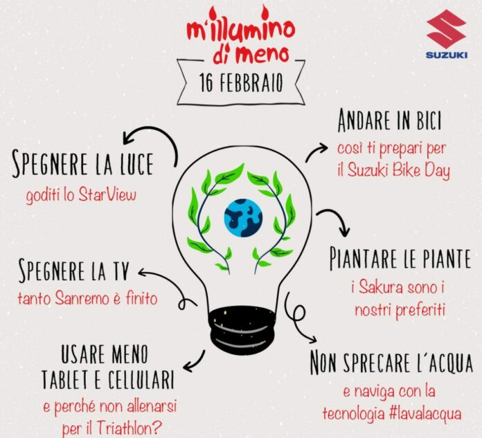 TORINO (ITALPRESS) – Spegnere le luci per accendere i riflettori sul tema della gestione efficiente dell’energia e di una vita quotidiana attenta all’ambiente. E’ questo il senso della campagna “M’illumino di meno”, che si svolge oggi, giovedì 16 febbraio, nell’ambito della Giornata del Risparmio Energetico e degli Stili di Vita Sostenibili e alla quale Suzuki e la sua rete di Concessionari aderiscono per il terzo anno consecutivo.
