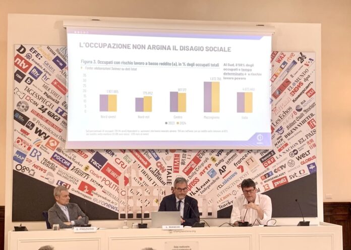 Nel 2024 la crescita dell’occupazione si è confermata sostenuta, soprattutto nel Mezzogiorno, dove il numero di occupati è aumentato del 2,2% su base annua – oltre 142 mila unità in più – contribuendo per il 40% all’incremento nazionale (+1,5%). La questione salariale italiana si riflette nella presenza di un’ampia platea di lavoratori poveri, soprattutto al Sud. La soglia di reddito annuo al di sotto della quale un lavoratore dipendente o autonomo viene definito povero è pari a circa 7.300 euro annui (circa 600 euro mensili). Al 2024, ricadono in questa condizione circa 4,6 milioni di lavoratori, pari al 21% del totale. Tale condizione al Sud interessa il 31,2% dei lavoratori, pari in numero assoluto a oltre 1,8 milioni. Rispetto al 2023 – si legge ancora – il recupero occupazionale non sembra aver alleviato il fenomeno del lavoro povero che risulta: in leggero peggioramento al Sud; stabile nel Nord-Ovest (16,6%; al 2024 1,1 milioni di lavoratori poveri); in deciso peggioramento nel Nord-Est (dal 14 al 15,6% del 2024; quasi 800 mila); in miglioramento significativo solo nel Centro (dal 20,5 al 19,4% del 2024; circa 900 mila).