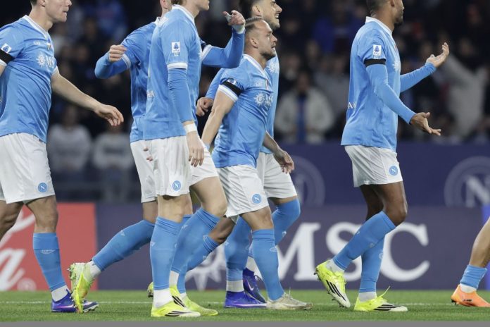 NAPOLI (3-4-3): Milinkovic-Savic 6.5; Beukema 6.5 (12′ st Lang 6), Rrahmani 6 (22′ st Buongiorno 6), Juan Jesus 7; Di Lorenzo 6, Lobotka 7, McTominay 5.5, Spinazzola 6.5; Vergara 6 (17′ st Mazzocchi 6), Hojlund 5.5, Elmas 6 (12′ st Politano 6). In panchina: Contini, Ferrante, Gutierrez, Olivera, Lucca, Marianucci, Ambrosino. Allenatore: Conte (squalificato, in panchina Stellini) 6.
