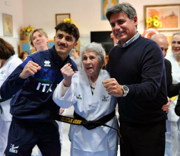ROMA (ITALPRESS) – Festa della donna, e che donna! Norina Mattiuzzi da San Giorgio di Piano, nel bolognese, dove nacque 100 anni fa. Un secolo che ha festeggiato in modo davvero speciale, unico. Tra i tanti regali ricevuti, una cintura nera ad honorem, che il presidente della Federazione Italiana Taekwondo, Angelo Cito, ha voluto consegnare personalmente. Accanto a lui Vito Dell’Aquila, campione olimpico a Tokyo.