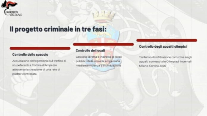 Il tutto anche con l’obbiettivo di favorire e monitorare lo spaccio all’interno dei locali; in ultimo, l’ingerenza negli eventi privati, già programmati a Cortina d’Ampezzo, in concomitanza delle prossime Olimpiadi Invernali “Milano-Cortina 2026”, nonché il tentativo di infiltrarsi, in chiave corruttiva, negli appalti connessi con i lavori per Olimpiadi; In sintesi, tre precise fasi di un unico disegno illecito tipico della criminalità organizzata: controllo dello spaccio; controllo dei locali; controllo degli appalti.