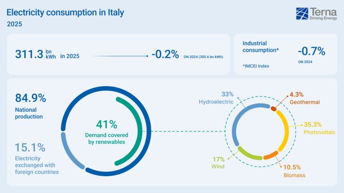 ROMA (ITALPRESS) – Secondo le rilevazioni di Terna, la società che gestisce la rete di trasmissione nazionale guidata da Giuseppina Di Foggia, nel 2025 i consumi elettrici italiani sono stati pari a 311,3 TWh, un valore sostanzialmente equivalente a quello del 2024. Lo scorso anno le fonti rinnovabili hanno coperto il 41% della domanda, rispetto al 42% del 2024. Tale risultato è la conseguenza di due effetti contrastanti: da un lato, il record annuale di produzione fotovoltaica, dall’altro, una produzione idroelettrica tornata a valori standard rispetto all’elevata idraulicità registrata nel 2024. Il fabbisogno elettrico del 2025 è stato caratterizzato da un andamento a due velocità: una prima parte dell’anno con variazioni tendenziali negative seguita da una seconda parte in ripresa anche grazie alla crescita dei consumi industriali. Infatti, l’indice IMCEI (Indice Mensile dei Consumi Elettrici Industriali) elaborato da Terna, che prende in esame i consumi industriali di circa 1.000 imprese “energivore”, è stato caratterizzato da una ripresa nella seconda parte dell’anno che, nonostante un calo nei primi mesi, ha consentito di chiudere l’intero 2025 in leggera flessione (-0,7%). In particolare, nel 2025, positivi i settori della siderurgia, meccanica, cemento calce e gesso e alimentari; in flessione metalli non ferrosi, chimica, mezzi di trasporto, cartaria e ceramiche e vetrarie. I primi dieci mesi dell’anno appena concluso mostrano una crescita dell’indice IMSER (Indice Mensile dei Servizi), che Terna pubblica sulla base dei dati dei consumi elettrici mensili forniti da alcuni gestori di rete di distribuzione (E-Distribuzione, UNARETI, A-Reti, Edyna e Deval), e che viene presentato in differita di due mesi rispetto ai dati dei consumi elettrici industriali, pari al +2,6%.