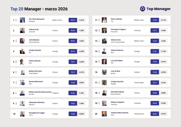 MILANO (ITALPRESS) – A marzo Pier Silvio Berlusconi (89.72), protagonista di una importante riorganizzazione di MFE, da holding a media company operativa, conquista il primo posto della Top Manager Reputation, l’Osservatorio permanente a cura di Reputation Manager. Il manager assume la doppia carica di presidente e Ceo portando a casa un utile 2025 più che raddoppiato rispetto all’anno precedente. Stabile al secondo l’Ad di Unicredit Andrea Orcel (89.49) che estende la sua azione su Commerzbank con una ops per superare il 30% di quote. Il Governo tedesco si oppone, ma il manager non è solito arretrare. Terzo Carlo Messina (88.92), AD di Intesa Sanpaolo che si conferma “Best Investment Bank” secondo Global Finance per il sesto anno consecutivo. Quarto l’Ad di Eni Claudio Descalzi (86.76), con utile del quarto trimestre che balza a 1,2 miliardi (+35%) mentre con la guerra in Medio Oriente il petrolio è al centro di una crisi globale.