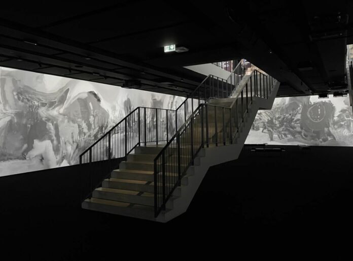 La sala immersiva del museo torinese della Banca si trasforma così in un teatro visivo e musicale dove il passato e il presente si avvicendano in modo ininterrotto attraverso una colonna sonora realizzata appositamente dall’inglese Robin Rimbaud (in arte Scanner) e dall’italiano Stefano Pilia, musicisti elettronici d’avanguardia.