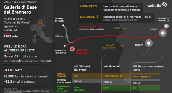 Uno dei più grandi e complessi progetti infrastrutturali oggi in corso in Italia, affidato dalla BBT SE (società per azioni europea finalizzata alla realizzazione della galleria) all’ATI (associazione temporanea d’imprese) guidata da Webuild. Ma soprattutto un’opera destinata a rivoluzionare la mobilità attraverso il Passo del Brennero e i collegamenti tra il sud e il nord d’Europa. Nei cantieri gli scavi procedono a ritmo sostenuto per la costruzione del maxi-tunnel ad alta velocità/alta capacità dove correranno i treni passeggeri a 250 km/h. Una grande opera non solo per l’Italia ma per l’Europa intera, tratta strategica per completare il collegamento del Corridoio 1 delle reti TEN-T per unire Verona con Monaco attraverso treni veloci e sostenibili. Una volta inaugurata la linea, per i cittadini europei cambierà il modo di viaggiare.