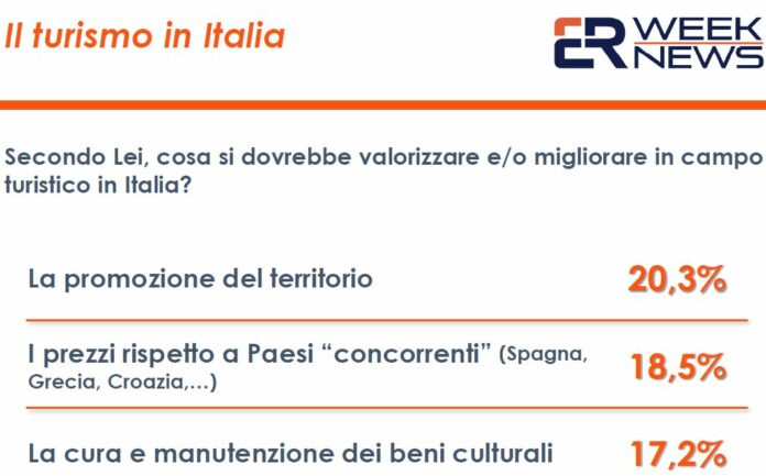 ROMA (ITALPRESS) – E’ tempo di vacanze e l’Italia, anche se con qualche difficoltà e con nuove regolamentazioni, riprova a ripartire sfruttando anche una delle risorse più importanti della nazione: il turismo. Un turismo, però, che secondo le percezioni di quasi 2 cittadini su 3, ad oggi, è ancora poco valorizzato. E’ necessario, quindi, intervenire in questa direzione puntando principalmente sulla promozione del territorio, soprattutto dopo gli effetti della pandemia e dei lockdown. Bisogna promuovere, dunque, il Paese Italia e il proprio territorio per attirare sempre più turisti, ma c’è bisogno – secondo un sondaggio di Euromedia Research – di un intervento anche sui prezzi che, secondo il 18,5% degli intervistati, sono ancora troppo alti rispetto a paesi concorrenti come, ad esempio, Grecia e Croazia, senza trascurare la manutenzione del nostro patrimonio artistico e culturale. Azioni necessarie per valorizzare il settore turistico italiano e riportarlo al livello degli altri paesi esteri, dove, secondo le sensazioni di quasi la metà degli italiani, i servizi legati al turismo sono sicuramente di livello superiore.