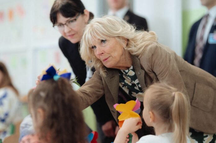 KOSICE, SLOVAKIA- May 8: Jill Biden, First Lady of the United States arrives at a primary school on Tomasikova street, Kosice, Slovakia on May 08, 2022. US First lady Jill Biden travelled to Romania and Slovakia to show support for Ukrainians fleeing from Russian attacks on Ukraine. Robert Nemeti / Anadolu Agency/ABACAPRESS.COM EU European Union Europe UE Union Europeenne Slovakia Slovaquie Slowakien Ukraine Etats Unis Etats-Unis United States of America USA Etats Unis USA United States of America United States US | BRAA20220508_538 Kosice Slovakia Slovaquie (Kosice - 2022-05-08, AA / ipa-agency.net) p.s. la foto e' utilizzabile nel rispetto del contesto in cui e' stata scattata, e senza intento diffamatorio del decoro delle persone rappresentate