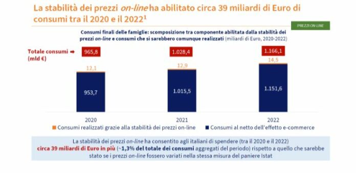 Un freno all’inflazione Infatti, la ricerca evidenzia che la diffusione dell’e-commerce consente di mitigare gli effetti dell’inflazione: nonostante la perdita di valore del denaro, i prezzi online si sono dimostrati più stabili negli ultimi tre anni rispetto a quelli del paniere Istat. Inoltre, proprio la stabilità dei prezzi on-line ha abilitato circa 39 miliardi di euro di consumi tra il 2020 e il 2022.