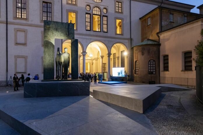 MILANO (ITALPRESS) – Una scultura dedicata a Sant’Ambrogio e realizzata per l’Università Cattolica da Mimmo Paladino, indiscusso maestro dell’arte contemporanea. L’opera, installata nel Cortile d’Onore dell’Ateneo, è stata presentata in anteprima alla città di Milano con il suo svelamento mercoledì 11 ottobre in un incontro serale. Dopo il saluto del rettore Franco Anelli, l’artista, in dialogo con Davide Rampello, figura di riferimento nel panorama culturale italiano, ha raccontato l’ispirazione e il senso profondo della scultura ideata e creata per l’Ateneo di largo Gemelli. ‘L’opera si colloca nel solco di un’antica tradizione di questa Università, il cui corredo iconografico, fin dalla prime committenze, ha mirato a rendere perspicui i riferimenti, i valori e le intenzioni che hanno ispirato la fondazione e lo sviluppo della fabbrica dell’Università. Il monumento a Sant’Ambrogio di Mimmo Paladino segue questa antica traccia rileggendo le stratificazioni storiche, artistiche, religiose del luogo, attive a partire dall’epoca paleocristianà ha dichiarato il rettore Anelli spiegando lo spirito della committenza nata in occasione del Centenario dell’Università Cattolica. ‘Ho accettato con grandissima gioia l’invito a realizzare un’opera per l’Ateneo. Inoltre, mi piaceva molto questa idea di committenza che non è molto frequentè, ha detto Paladino rispondendo alle domande di Rampello. Un dialogo breve e intenso, preceduto dalla proiezione di un video descrittivo delle tappe per la realizzazione della scultura: dalla fonderia Brustolin di Verona, dove l’opera ha preso vita, fino alla collocazione nel Cortile d’Onore, posta in un dialogo ideale con la Basilica, che conserva le reliquie di Sant’Ambrogio, e la facciata dell’Ateneo di Giovanni Muzio. Due luoghi storici con cui l’artista si è profondamente confrontato per la creazione dell’opera. «Ho dovuto fare i conti con due importantissime situazioni architettoniche: da un lato, la Basilica di Sant’Ambrogio, dall’altro, un’antica e prestigiosa università dove si forgia l’istinto, la passione, la ragione». Ragione espressa in tutta la sua funzionalità anche nel «basamento», che è parte dell’opera ed è stato realizzato tenendo conto non solo delle «architetture circostanti» ma anche della presenza degli studenti, che quotidianamente vivono questo luogo: volevo offrire loro la possibilità di sostare, conversare piacevolmente, trovarvi la loro ‘piccola agorà’. Una scultura che è insieme ‘paesaggiò e ‘teatrò, ha ribadito Rampello. ‘L’opera è pensata per le lunghe distanze, per gli spettatori da qui a cent’anni e più, forse – ha detto Paladino -. E’ un omaggio a Sant’Ambrogio, eroe della conoscenza. Non ci sono riferimenti iconografici al Santo così come vengono tradizionalmente rappresentati. Ho preferito andare oltre, immaginare qualcosa di più, come don Chisciotte che vedeva guerrieri nei mulini a ventò. La scultura, realizzata in bronzo patinato, ha una dimensione di base di 220cmx180 e una altezza di 370cm per un peso di 1.680Kg. L’opera di Mimmo Paladino in tutti i suoi attributi iconografici ripercorre i tratti salienti della vita del patrono di Milano. Il ramo simboleggia il bastone pastorale, ma richiama anche lo staffile che rappresenta la forma, la veemenza e la profondità delle omelie che predicava al popolo. Il libro ricorda gli scritti di Ambrogio: l’epistolario, i trattati e gli inni ed è il simbolo della dottrina cristiana. La colomba dello Spirito Santo evoca Sant’Ambrogio a cavallo che scaccia gli Ariani. La sfera rappresenta la completezza della Dottrina. La colonna, invece, rimanda alla leggenda della lotta tra il santo e il diavolo che, cercando di colpire il vescovo con le corna, finì per conficcarle nella pietra creando due buchi. La tradizione popolare vuole che i due fori odorino di zolfo e che appoggiando l’orecchio alla colonna si possano sentire i suoni dell’inferno, in particolare il gorgogliare dello Stige, uno dei cinque fiumi degli inferi secondo la mitologia greca e romana. E, per finire, l’elmo ricorda come in epoca altomedioevale la basilica di Sant’Ambrogio divenne la sede tradizionale dove avveniva l’incoronazione a re d’Italia degli imperatori del Sacro Romano Impero e dove si effettuava l’investitura dei nuovi cavalieri, detti per questo motivo “militi di Sant’Ambrogio”. L’opera è collocata su una serie di piani inclinati in pietra grigia (beola) locale, al centro di due assi ortogonali e su una base con altezza di 140cm, posta frontale rispetto alla facciata laterale della Cappella del Sacro Cuore. Leggère pendenze dei piani e piccole altezze permettono ai visitatori di soffermarsi e sedersi lungo tutto lo spazio per osservare la scultura, ma anche di vedere lungo nuove direttrici prospettiche i monumenti circostanti. Particolare attenzione è riservata all’illuminazione, curata nei dettagli dallo stesso artista: la scultura è valorizzata con una luce quasi frontale e un controluce dal basso, mentre i piani inclinati hanno una luce lineare radente in modo da mettere in evidenza la materia della pietra. L’omaggio di Paladino a Sant’Ambrogio è anche ricco di riferimenti alle origini normanne e longobarde dell’artista: la colomba che può essere vista come un falco o i richiami a Federico II. Lo stesso iconico portale si ispira agli altri due lavori precedentemente realizzati dall’artista: la Porta del Mediterraneo di Lampedusa e la Porta dell’accoglienza del Refettorio di Milano. ‘C’è questa sorta di idea primitiva della casa, il dolmen, un architrave con due elementi verticali, che è anche una soglia che si varca». Una sorta di accesso-soglia a un’altra dimensione in cui, come ha suggerito Rampello, si intravede ‘misterò, ‘tensione verso il sacrò. ‘Il concetto della porta è quello dell’attraversamento, del superamento, dell’anda