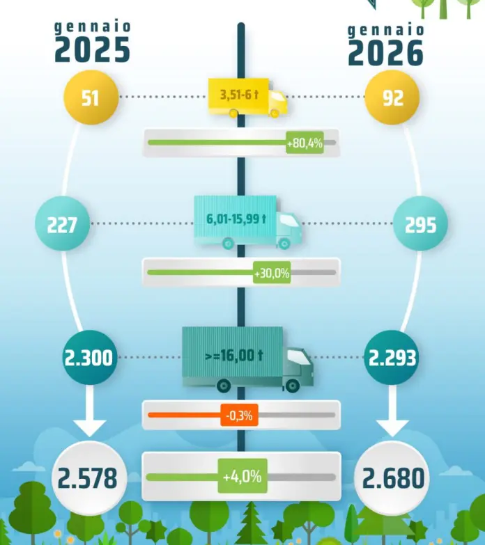 ROMA (ITALPRESS) – Nel mese di gennaio, il mercato dei veicoli industriali chiude con un avanzo del 4,0%, con 2.680 immatricolazioni rispetto alle 2.578 registrate nel 2025. Il segmento dei veicoli pesanti, con massa pari o superiore a 16 t, risulta sostanzialmente stabile, segnando il -0,3% su base mensile.