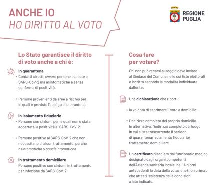 Il diritto al voto è assicurato anche a chi è in isolamento fiduciario, cioè persone sintomatiche per le quali non vi è accertamento di positività al SARS-CoV-2, oppure persone positive al SARS-CoV-2 che non hanno bisogno di alcun trattamento (contagiati asintomatici o paucisintomatici) e infine per quanti sono in trattamento domiciliare, ossia soggetti positivi sintomatici in trattamento per infezione da SARS-CoV-2.